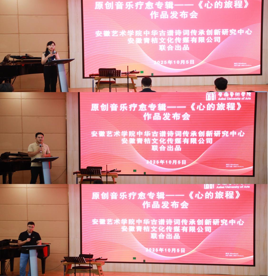 此次宣发活动的两大成果 —— 音乐剧《李白》签约与《心的旅程》专辑发布,分别从舞台艺术与音频作品两个维度,展现了安徽艺术学院中华古谱诗词传承创新研究中心在艺术疗愈领域的科研实力与创新探索。前者“古为今用”以古谱诗词为核心,将传统文化与现代疗愈、文旅产业相结合,为传统文化现代表达开辟新路径;后者“洋为中用”聚焦当代人心理健康需求,用科学、专业的音乐创作提供实用的疗愈解决方案,为原创五声音乐疗愈领域注入活力。