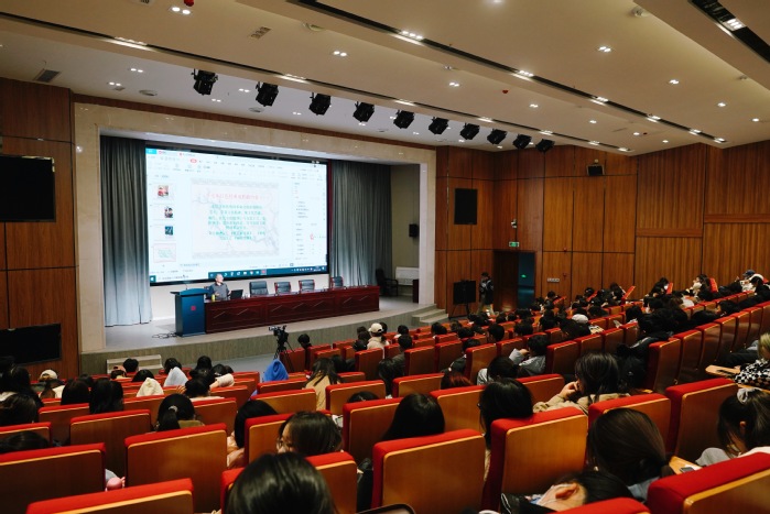 11月23日上午,南京艺术学院党委常委、统战部长、人文学院院长、博士生导师沈义贞教授在综合楼5楼报告厅举办《红色经典电影欣赏》讲座。新闻播音系特聘教授、纪录片(短视频)研究院执行院长禹成明出席讲座。讲座由新闻播音系党总支书记、主任王琍琍主持,200多位师生现场聆听讲座。