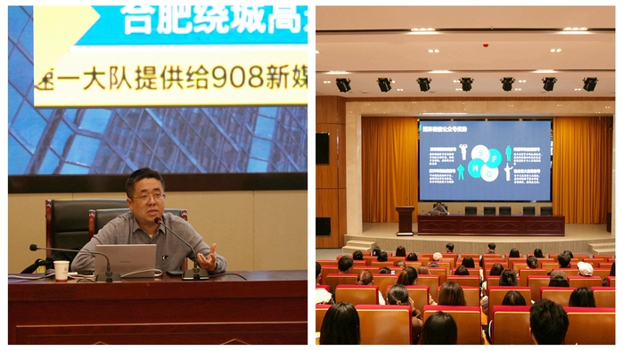 3月8日下午,新闻播音系在综合楼五楼报告厅举办2022年第一期少荃湖传媒讲坛,特邀安徽交通广播新媒体部主任鲁俊作《短视频的选题如何制作》讲座。新闻播音系副主任尹广富、系党总支副书记曹磊参加活动。