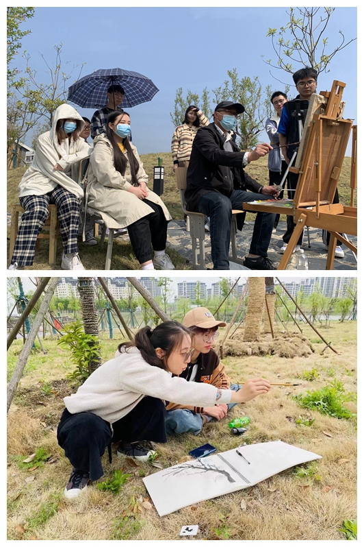 近日的艺术实践周,来自美术设计系绘画专业的百名师生在春意盎然的安艺校园内各选理想角度,支起画架,用画笔记录校园春色。