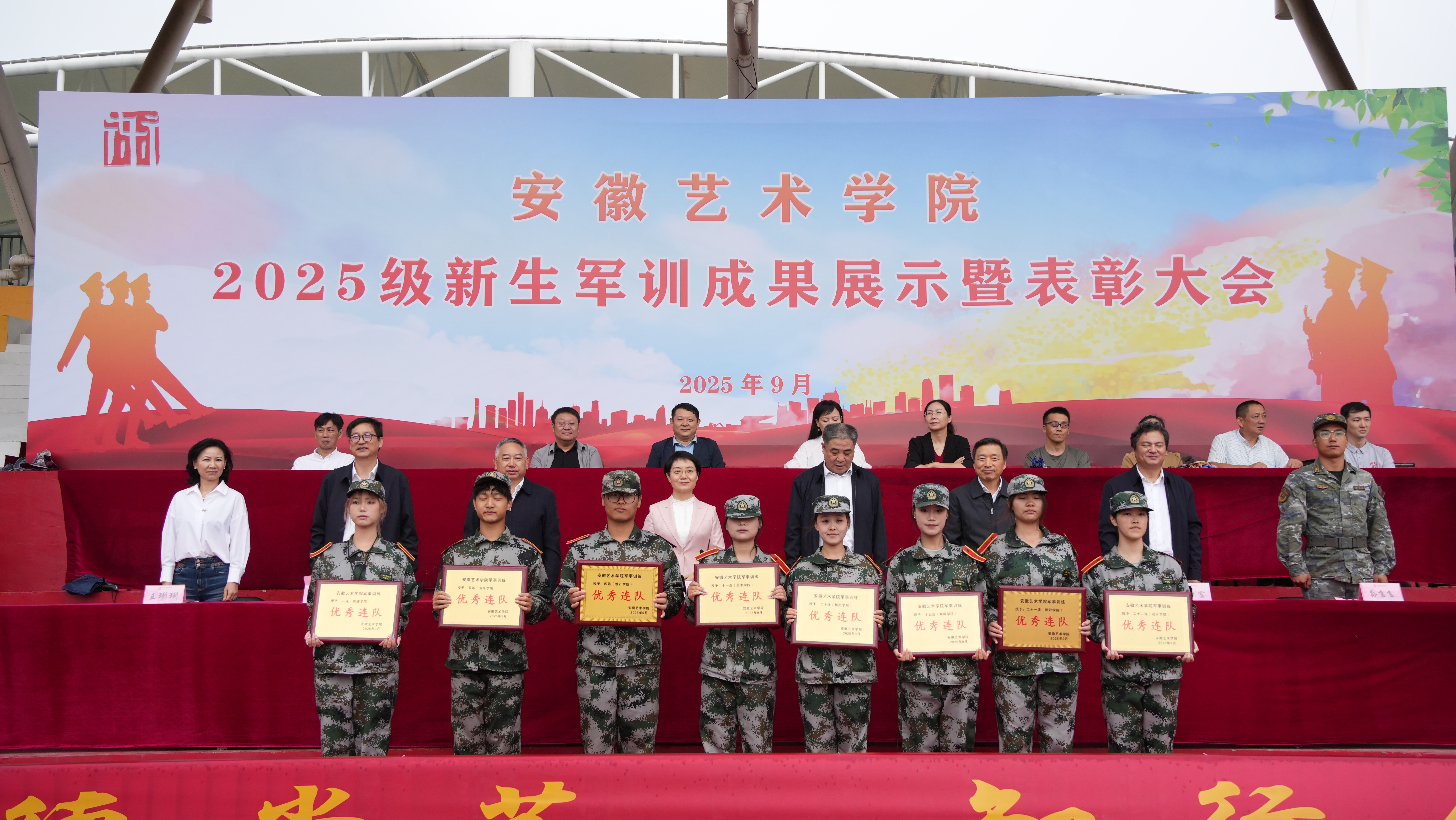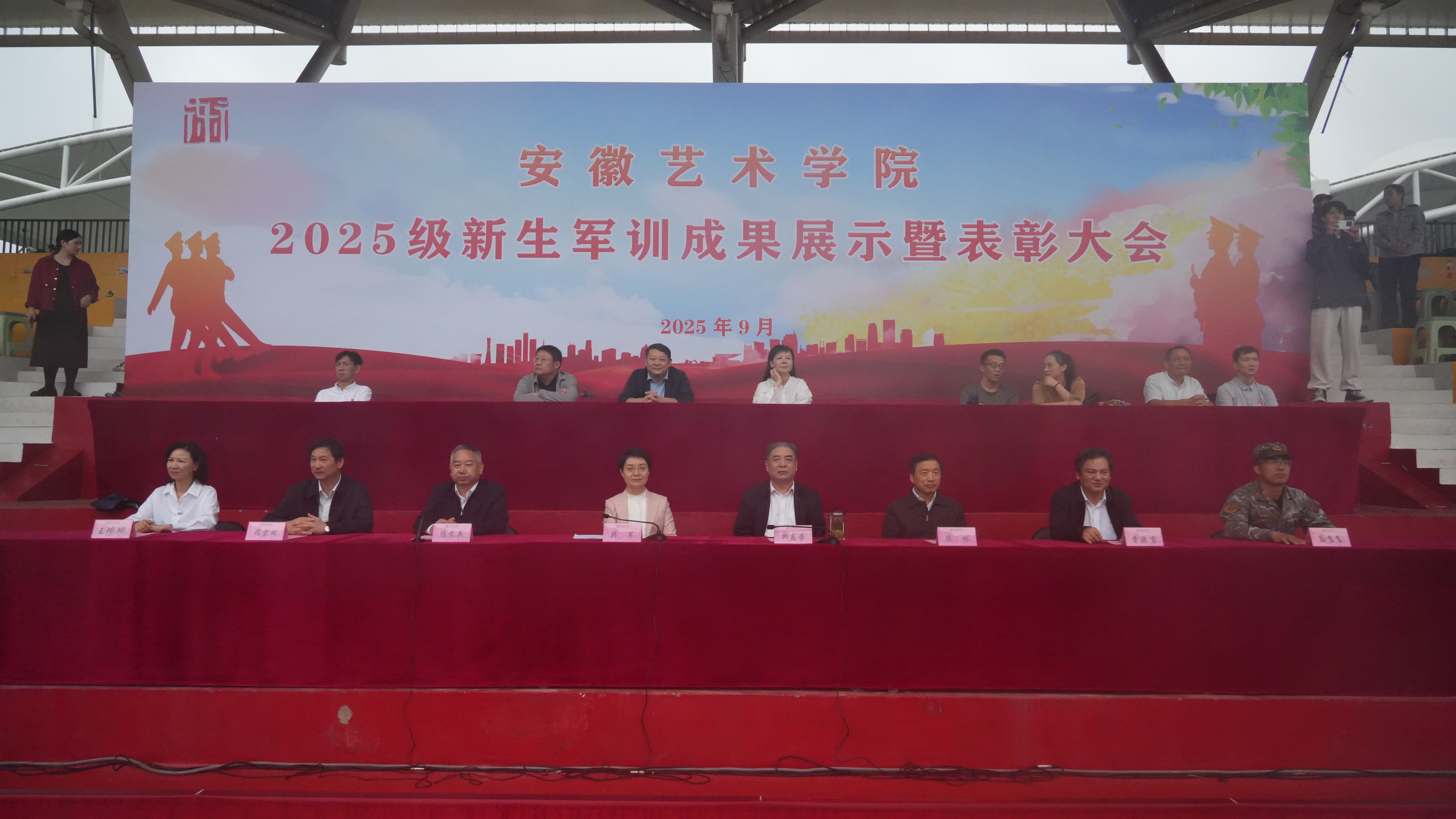 9月29日上午,我校2025级新生军训成果展示暨表彰大会在校运动场举行。校党委书记韩军,党委副书记、校长柳友荣,党委副书记陈文兵,党委委员、副校长陈林,党委委员、纪委书记、监察专员程宗林,党委委员、副校长、教师工作部(人事处)部长(处长)曹晓富,党委委员、组织部部长王琍琍,承训部队首长张飞飞等出席大会。大会由韩军主持。