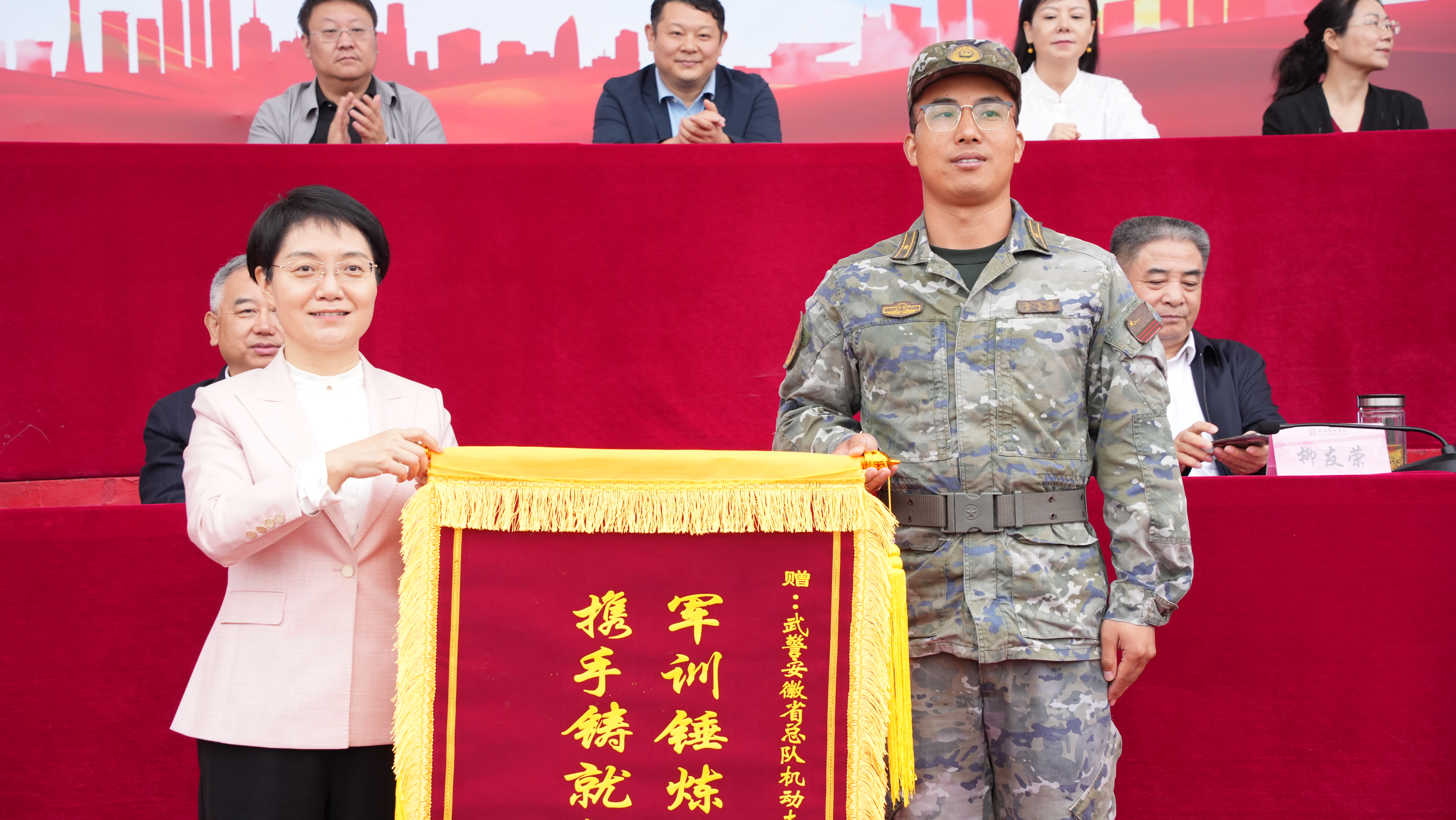 校党委书记韩军向承训单位武警安徽省总队机动支队赠送锦旗,感谢部队教官在军训工作中的付出和努力。