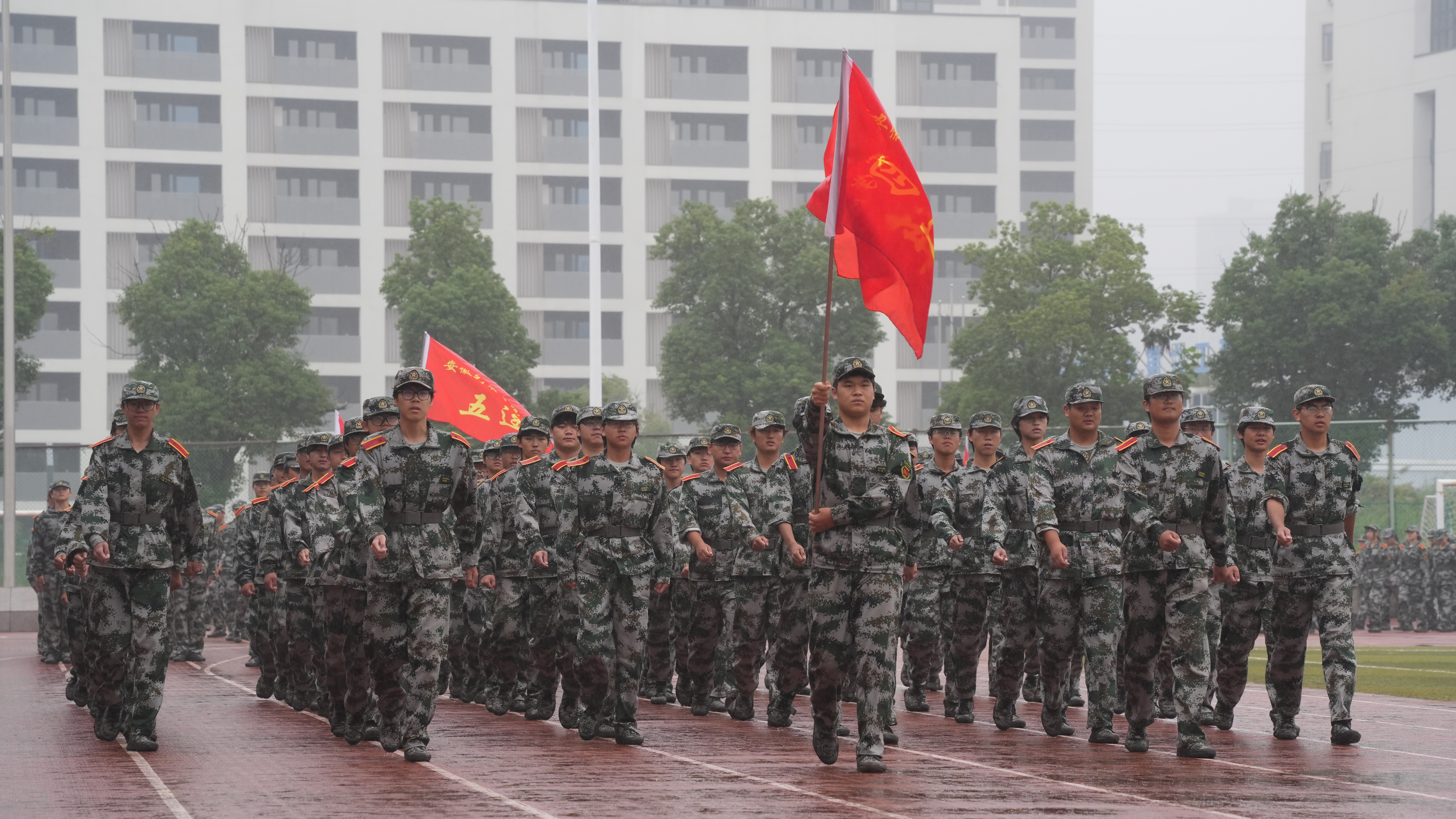 随后,各营连方队依次入场受阅。新生身着统一迷彩服,口号嘹亮、步伐铿锵、目光坚定,以饱满的精神状态走过主席台。整齐的队列、刚劲的动作、响亮的口号,充分展现军训丰硕成果,赢得现场领导与师生阵阵掌声。