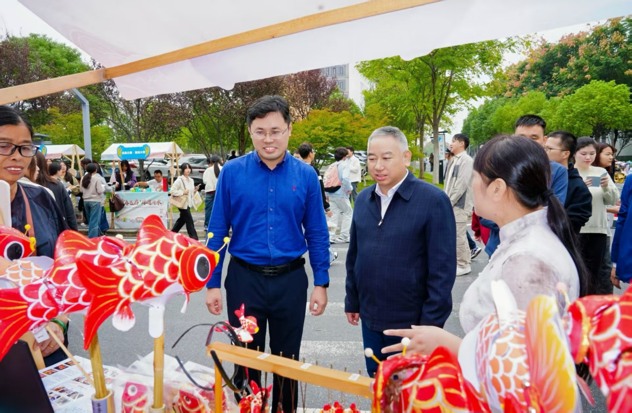 活动现场,各具特色的非遗项目令人目不暇接。传承人们带着匠心与故事,将安徽各地的文化精髓“搬”到了校园。在民俗技艺展区,渔梁鱼灯流光溢彩,传承人的舞动让人仿佛穿越到徽州古镇的热闹市集;金寨手绣针法细腻,绣出的花鸟栩栩如生;蚌埠草编、亳州木雕构思精巧,展现出民间智慧;庐州金饰光泽温润,传统錾刻工艺令人赞叹;池州喜拓前排起长队,师生们亲手压印吉祥纹样,体验传统技艺的魅力。