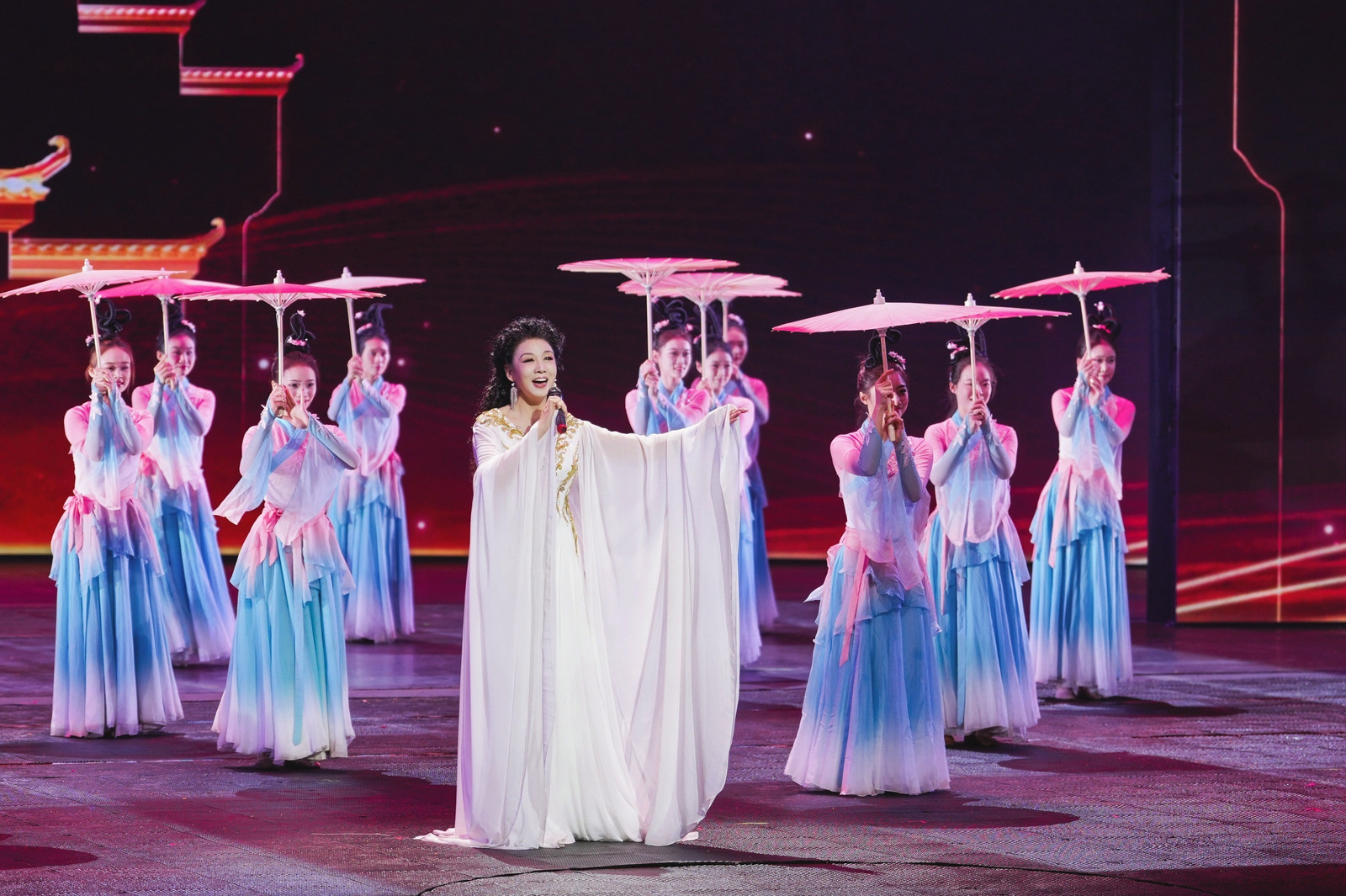 舞蹈学院师生紧扣“美好安徽,迎客天下”文化旅游主题,组建创作表演团队,与黄梅戏名家韩再芬携手完成黄梅戏歌节目《天下黄梅》。该节目以《山野的风》《天下黄梅》两段广为流传的唱段为基础,融入伞舞元素,勾勒出一幅江南女子温婉秀丽的人文画卷。