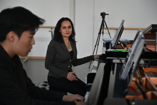 作为世界最顶尖韦尔比耶音乐节学院的钢琴家,同时也是苏黎世艺术大学钢琴合作导师,卡特教授在大师班中充分展现了其作为独奏钢琴演奏家和艺术指导的双重专业素养,为学生们提供了全面的指导。她指导学生分析乐曲中的声部进行与和声色彩,探讨如何通过踏板的细致运用模拟人声的呼吸感与乐句流动性,强调“即使作为独奏者,也需感知音乐中潜在的声部互动,塑造更立体的音乐叙事”。