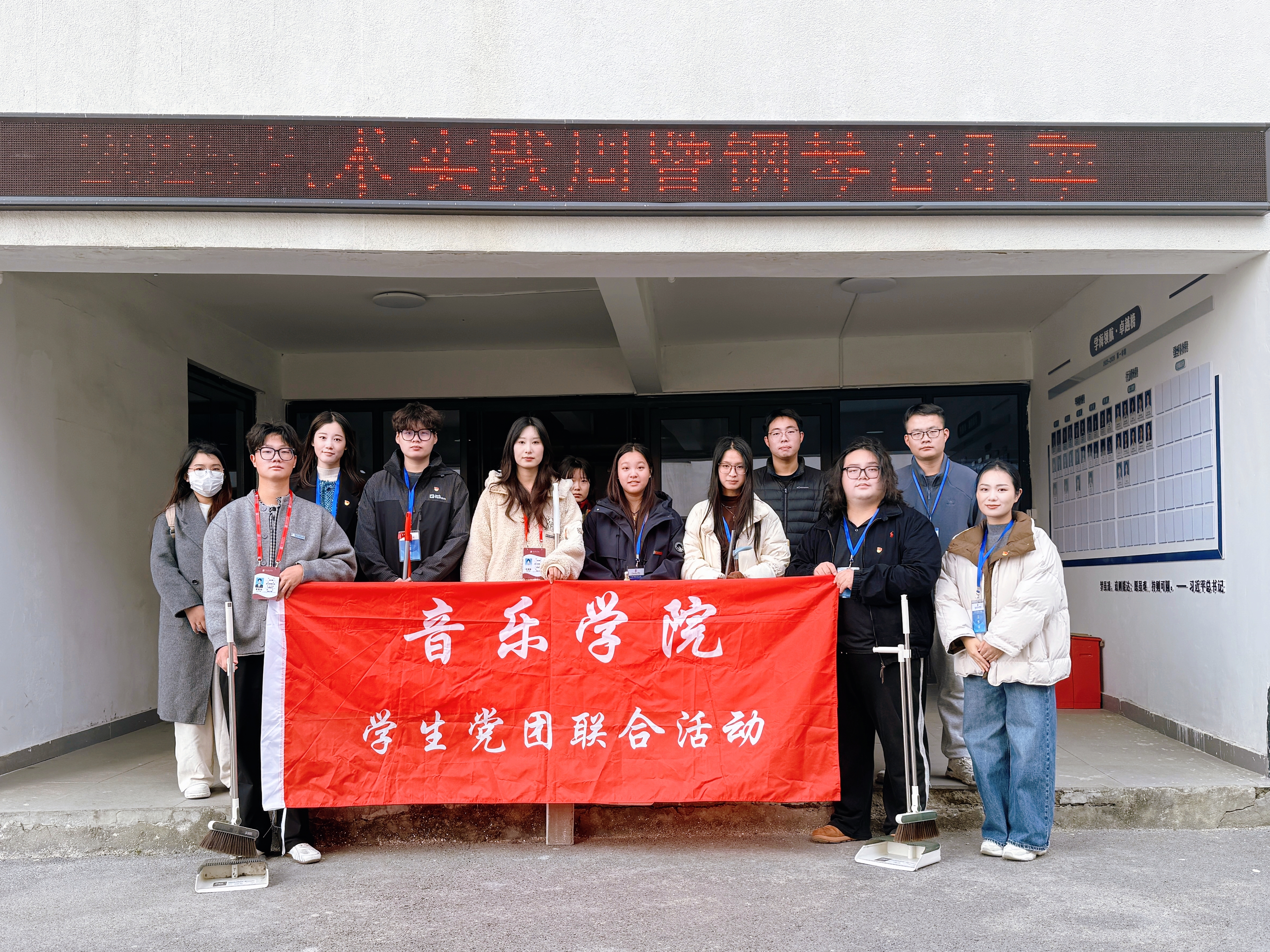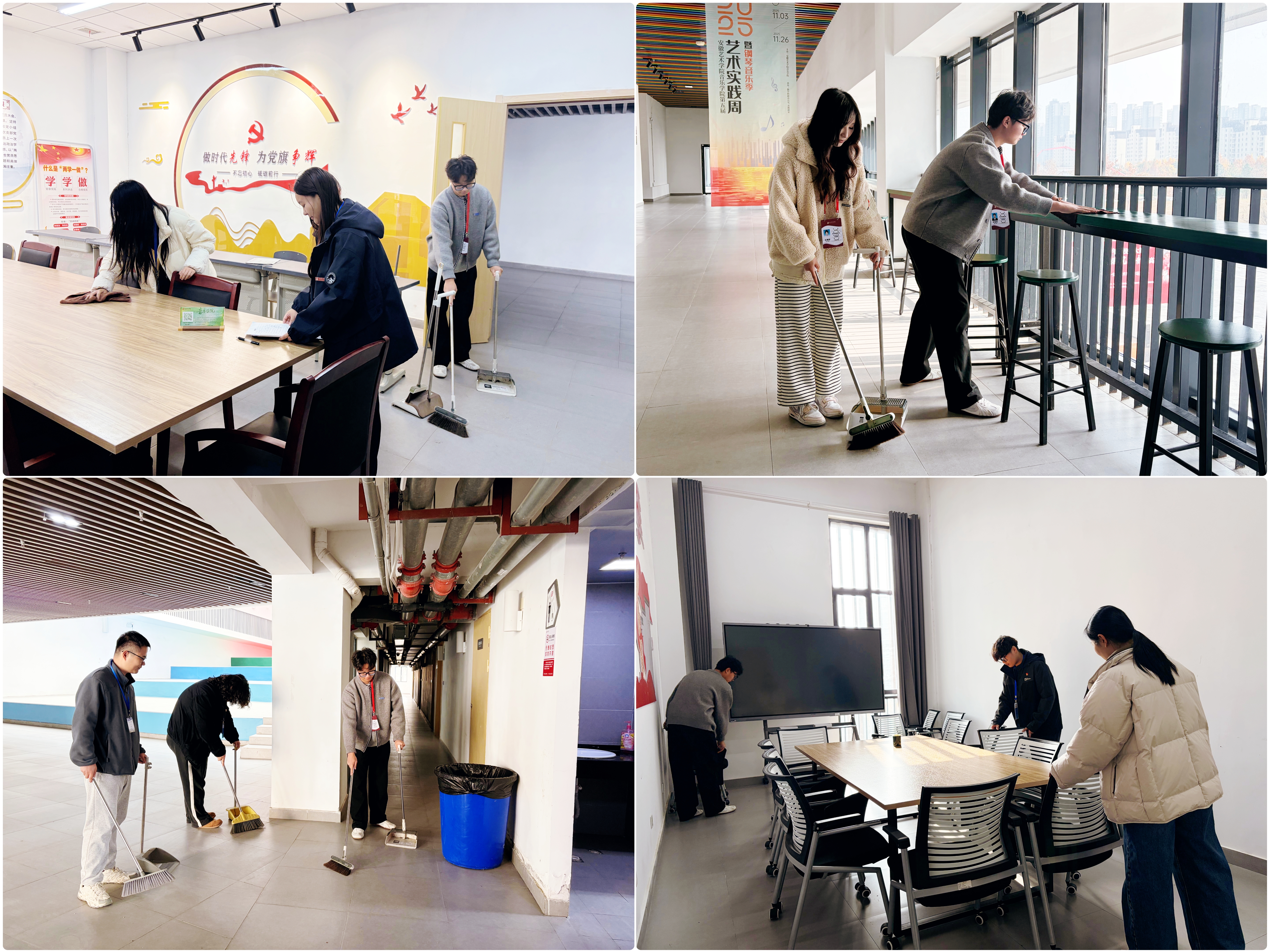为深入学习贯彻党的二十届四中全会精神,践行服务师生宗旨,12月1日中午,音乐学院学生党支部和团总支联合开展“我为师生办实事”实践活动,组织学生党员、团员对音乐学院公共区域进行卫生清扫。音乐学院学生党支部书记张珂、团总支书记梅倩带队,各年级党团员骨干积极参与。