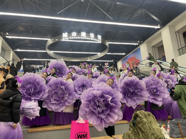 女生团队则以柔美灵动的风格,为舞台注入诗意与温婉。143名女生主要承担“主会场玉兰花伞”与“三河古镇群众表演”两个部分的表演,在“主会场玉兰花伞”部分中,她们手持玉兰花伞,身着素雅服饰,通过轻盈的舞步、流畅的队形变换,勾勒出如诗如画的江南意境,将徽派文化的雅致与柔美展现得淋漓尽致;在三河古镇的实景表演中,她们与男生团队及其他演员相互呼应,用灵动的舞姿还原古镇的热闹氛围,让观众感受到合肥的人文底蕴与生活气息。学子们既能精准驾驭不同风格的表演,又能完美契合演出定位,将专业素养与实践能力充分融入舞台表现之中,一刚一柔间正是学院“高素质、强能力、精才艺、善应用”人才培养的生动体现。