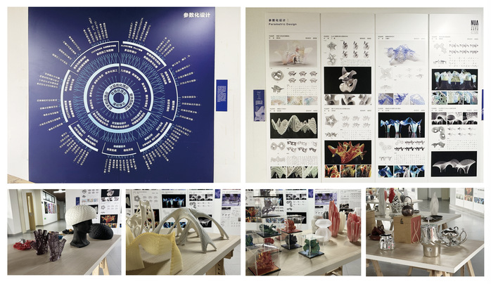 本次展览以高水平学生作业实物为核心,作品门类多元、亮点突出,全面展现设计教学的前沿探索与扎实成果。其中,参数化设计为重点板块,通过原理图表、设计版面及3D打印实物,直观呈现该技术在建筑、日用品、首饰等领域的应用。同步还展出参数化系列教材,为教学提供了系统理论支撑。