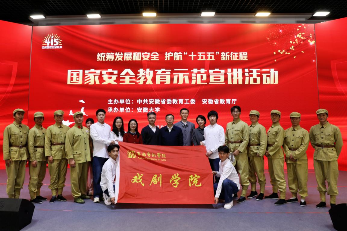 在第11个全民国家安全教育日到来之际,学校原创话剧《抉择》作为核心展演节目精彩亮相安徽省国家安全教育示范宣讲活动。安徽省委书记、省人大常委会主任梁言顺,省委副书记、省长王清宪,省委常委、宣传部部长钱三雄等省领导现场观摩并高度肯定师生们的演绎。校党委书记范奇出席活动。