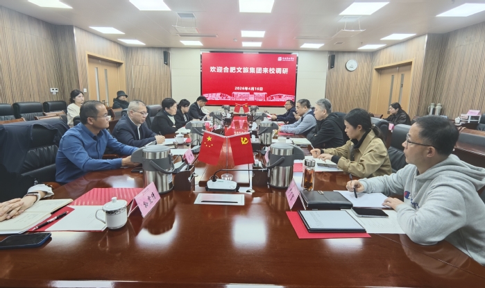 4月16日,合肥文旅集团党委书记、董事长尹传桂一行来学校调研交流,学校党委副书记、校长柳友荣接待来访。双方就文创设计、演艺演出、节目共创和实习就业等校企合作内容开展深入交流。