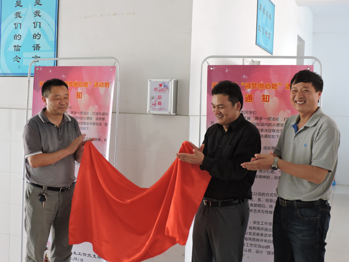 6月12日下午,由学生工作党支部、学生处、团委联合主办的校园“圆梦微心愿”活动揭幕仪式在二号教学楼举行。学院党委“两学一做”学习教育协调小组办公室主任、学院组织人事处处长曹晓富,学生工作党支部全体成员,学生代表参加了仪式。揭幕仪式由学生工作党支部书记、学生处处长刘长华主持。