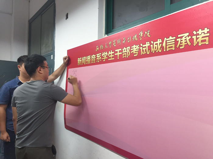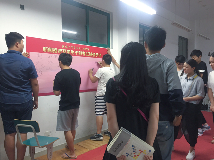 期末考试将至,为了创造良好的考风考纪,6月24日,新闻播音系学生管理办公室带领团总支、学生会干部、学生团代表举行诚信考试签字仪式。