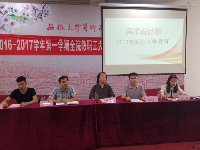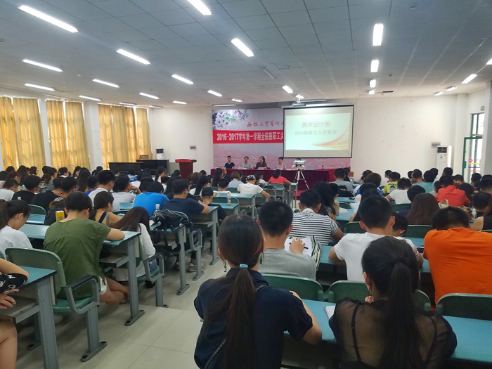 按照学院迎新工作统一部署,9月10日下午,美术设计系在第二阶梯教室举行2016级新生入学教育大会。系副主任(主持工作)罗耀东,党总支书记胡义文,教学科研管理办公室主任刘勇,团总支书记赵晨,学生党支部书记叶明胜,2016级全体新生和班主任参会。