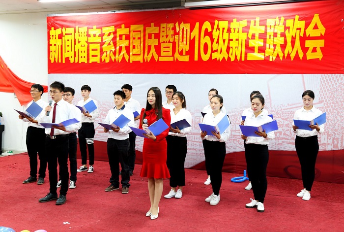 9月29日下午,在学院一号教学楼第二阶梯教室里,歌声飞扬、掌声欢呼声此起彼伏,新闻播音系在这里举办“庆国庆暨迎16级新生”联欢会。院团委书记陈明、音乐舞蹈系主任孙来法、新闻播音系副主任王琍琍、党总支副书记张志云、办公室主任刘涛及部分老师莅临现场和16级100名新同学观看了演出。