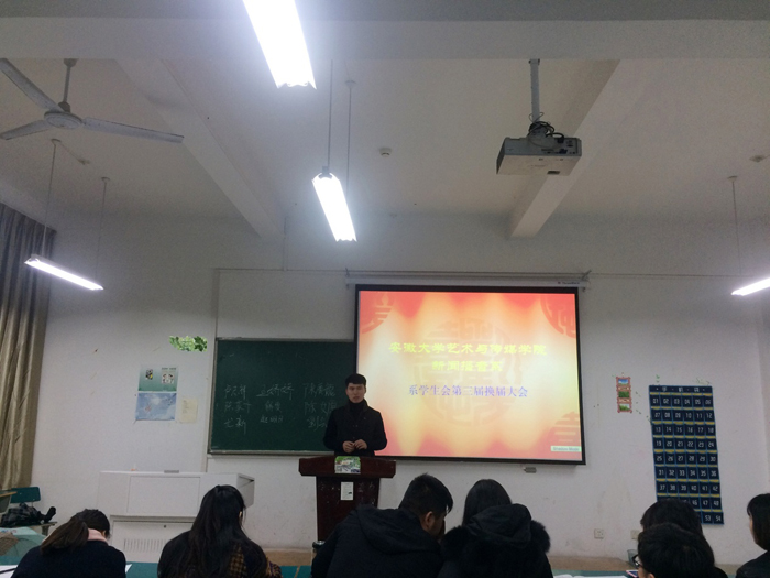 12月13日中午,新闻播音系学 会第三届换届选举大会在2教202成功举行。新闻播音系团总支书记陈伟伟、团总支副书记申莹和、学生管理办公室秦帅、康宁老师出席了此次大会,学生会主席团、主要干部以及参加竞选的学生会成员参加了此次大会。