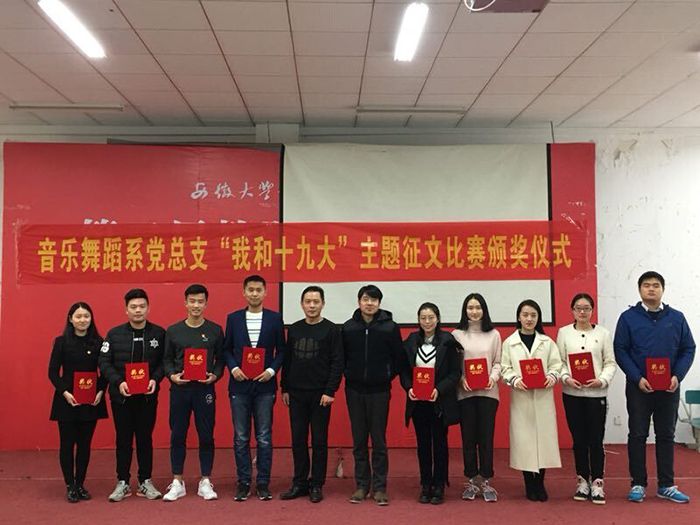 为贯彻落实十九大学习精神、全面推进学生群体学习十九大精神的热潮,由音乐舞蹈系党总支主办,音乐舞蹈系学生党支部、系团总支承办 的“我和十九大”主题征文比赛于12月1日中午在第三阶梯教室举行颁奖仪式,使得活动圆满落下帷幕。