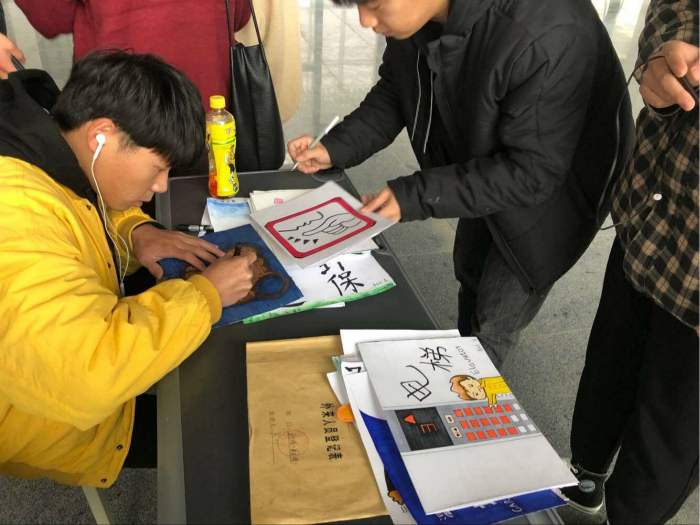 活动开始前,各位成员积极用心地准备小标牌,运用自己的美术设计功底,设计出花样繁多的小标牌。活动过程中,几个部门分工行动,井然有序地将小标牌粘贴于美术楼各处。