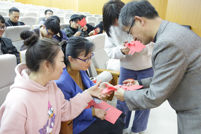 剪纸艺术历史悠久,风格独特。葛庭友详细讲解了阜阳剪纸的历史源流、花纹寓意和特色刀工等,并示范了几种剪法,然后指导同学们自己动手操作。教学过程中,同学们听得聚精会神,不时惊叹葛老师高超的技艺。(张娟娟)