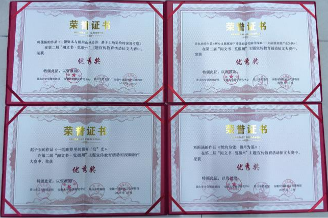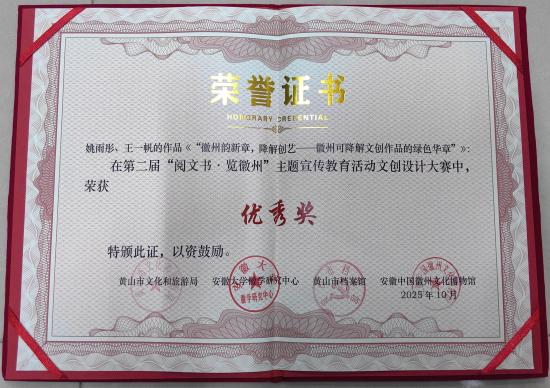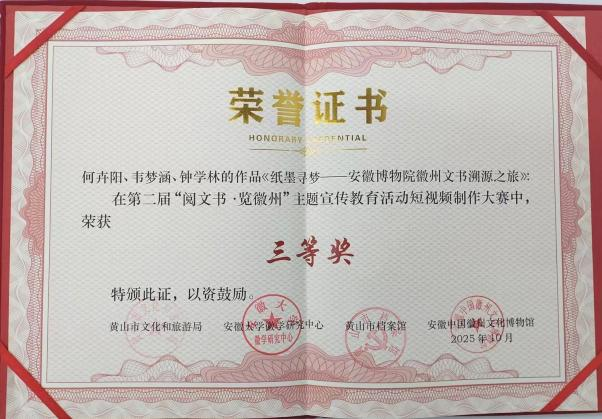 近日,在黄山市文化和旅游局、安徽大学徽学研究中心、黄山市档案馆联合主办,安徽中国徽州文化博物馆牵头承办的第二届“阅文书·览徽州”主题宣传教育活动评选中,我校学子表现突出,荣获征文、短视频、文创三大赛事的奖项。