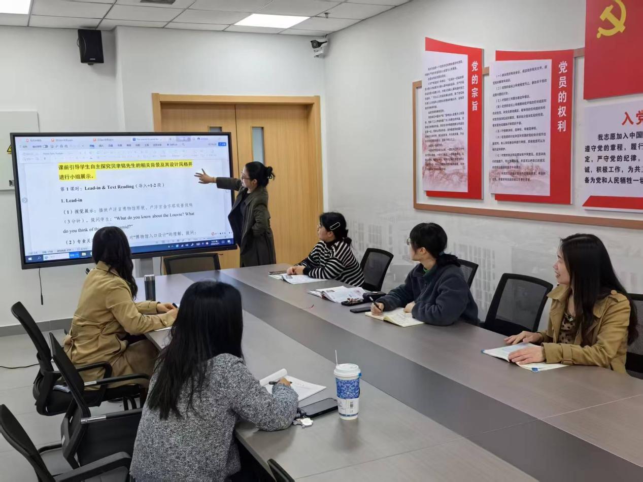 本次集体备课分为两大环节。第一个环节,主备课人向雅茹老师围绕大学外语(英语)B层课程教材第三单元阅读课 “The Louvre Pyramid That Shocked Paris” 展开说课。向老师从课前导学、课堂导入、文本研读等维度,细致讲解了本次课程的核心教学目标、完整教学流程与课堂活动设计,明确课程重难点,结合艺术类学生学情规划课堂环节,兼具专业性与针对性。