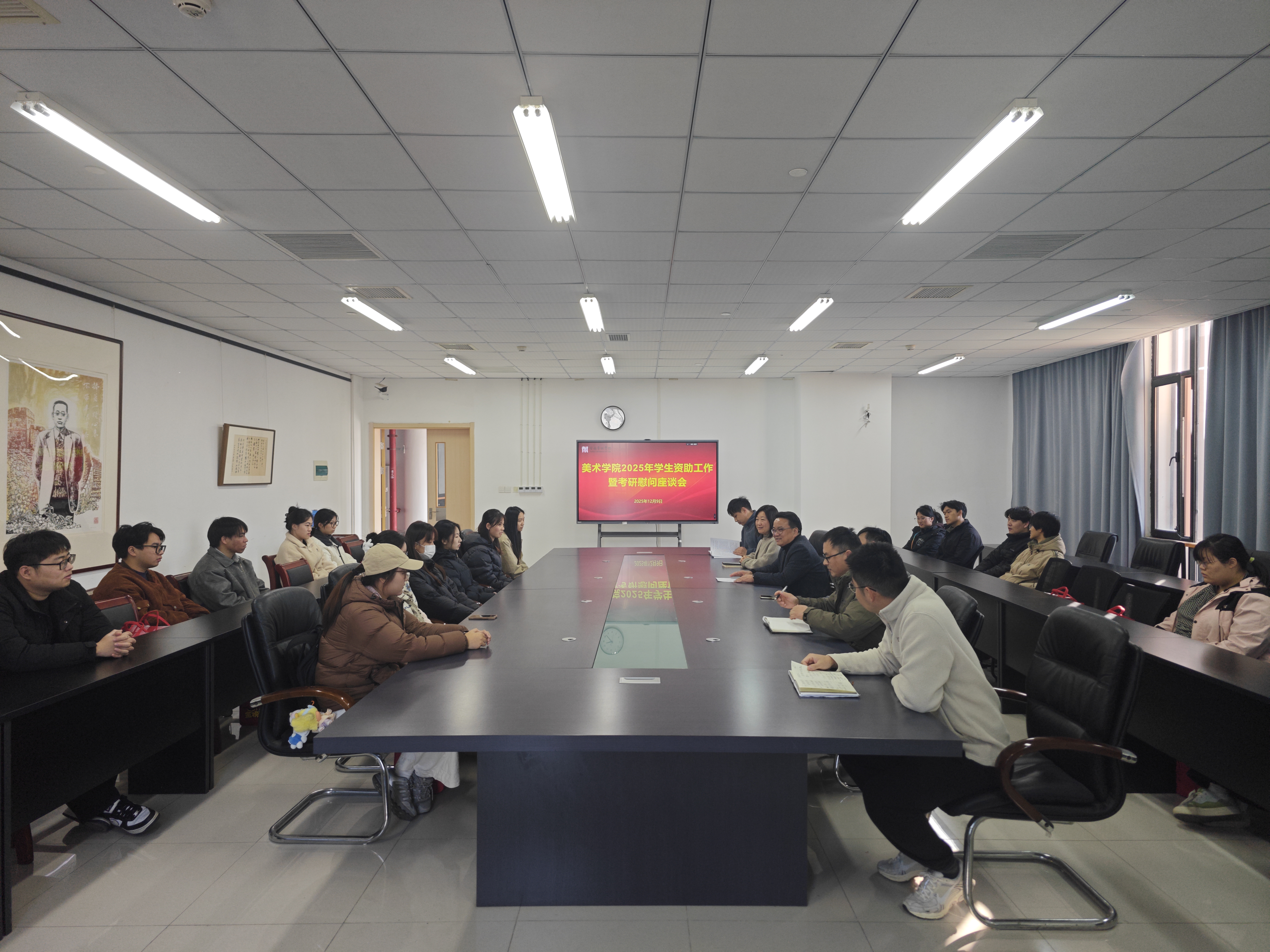 寒冬送暖,情系学子。129日,美术学院在307会议室召开2025年学生资助工作暨考研慰问座谈会。美术学院党总支书记陈明海,副院长李李、吴晗华出席座谈会,学管办、团总支、毕业班辅导员、受资助学生及2026届考研学生代表参会。