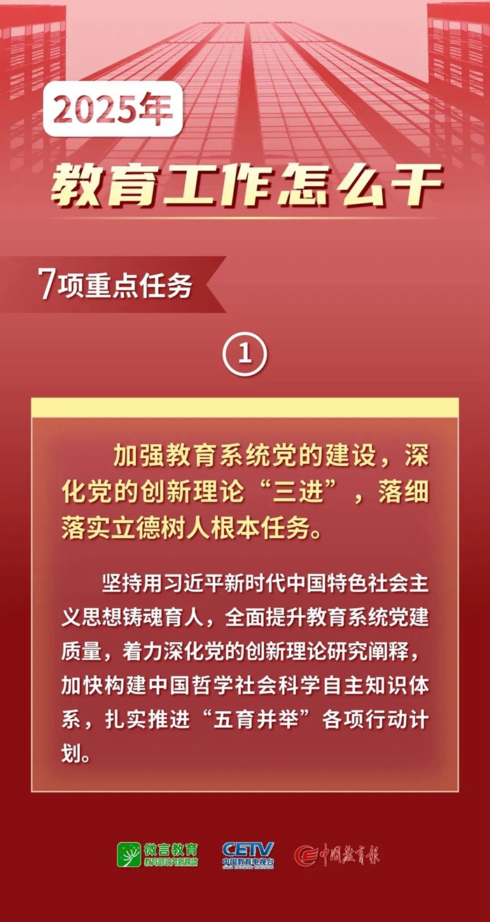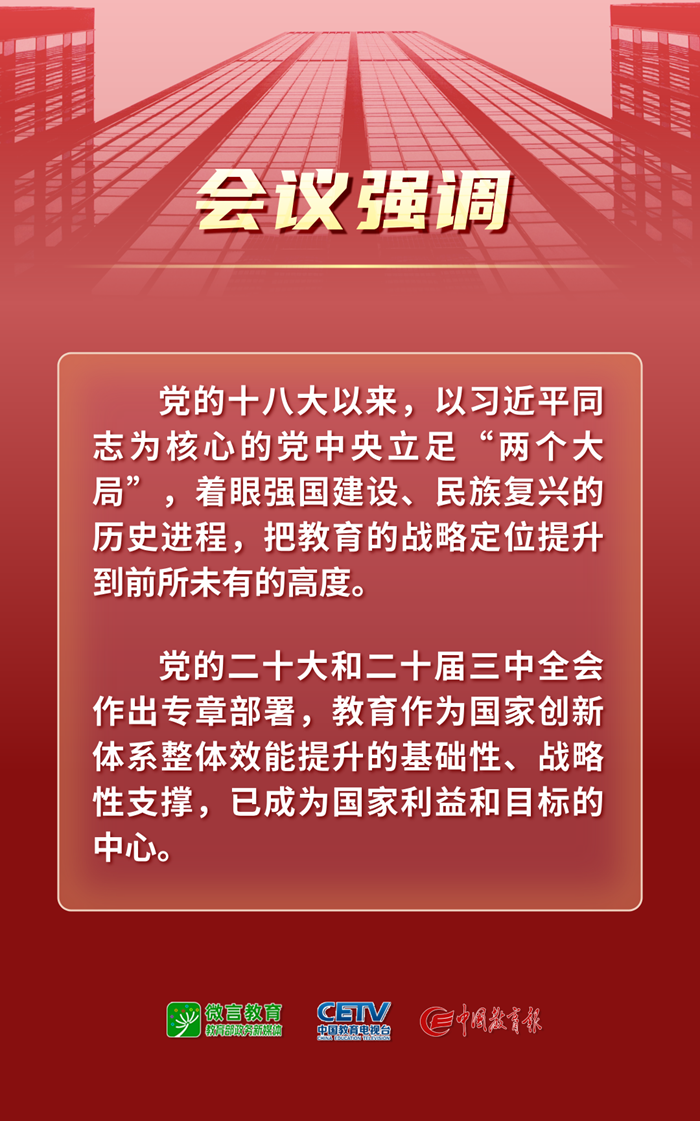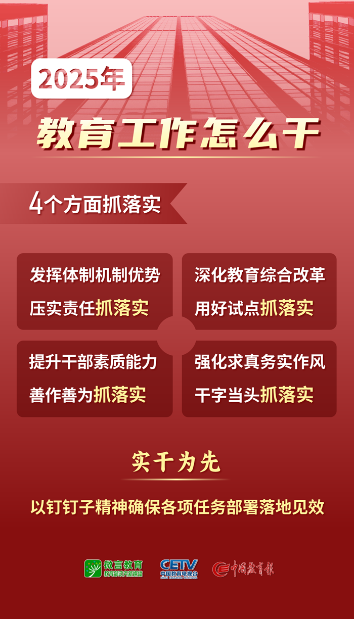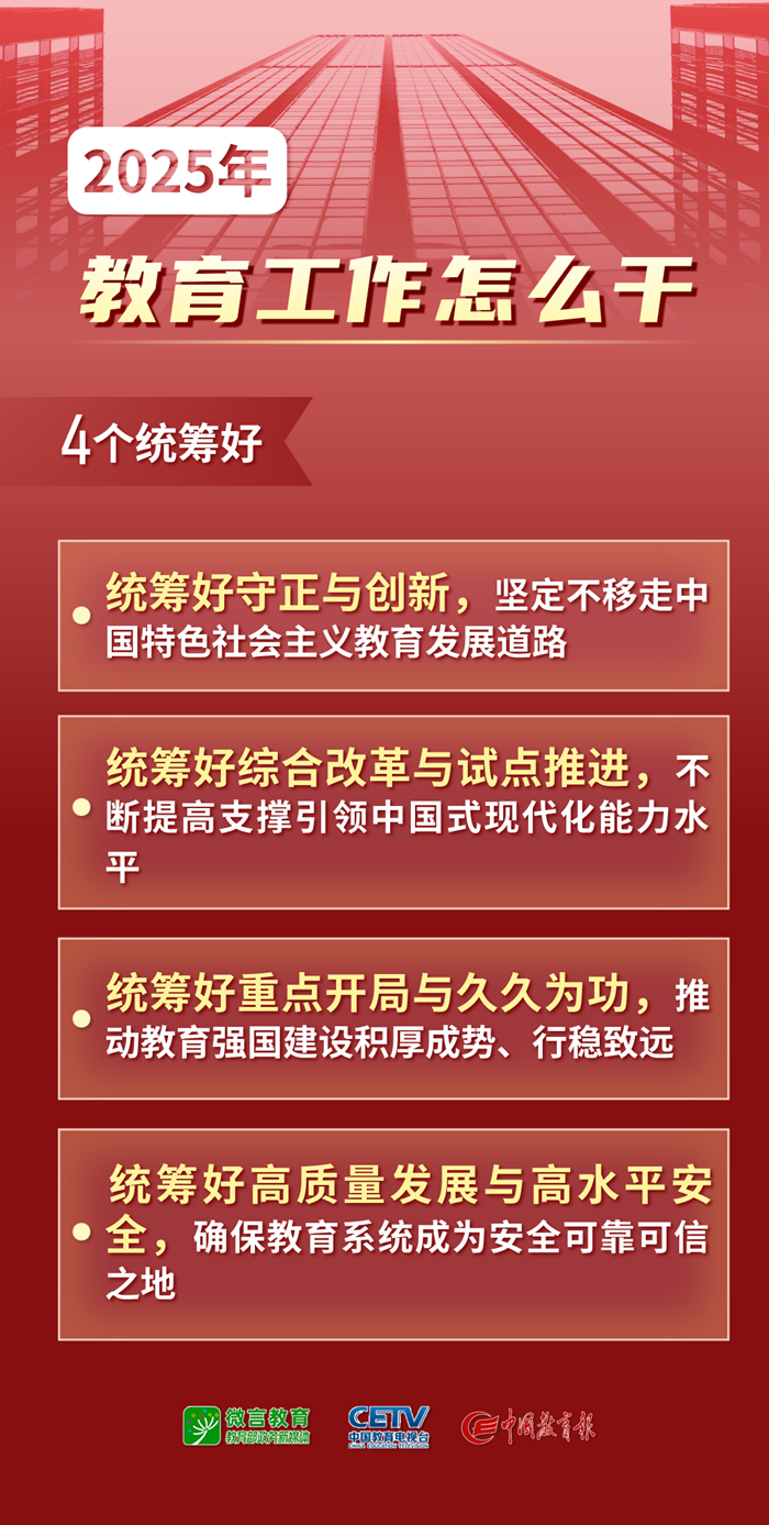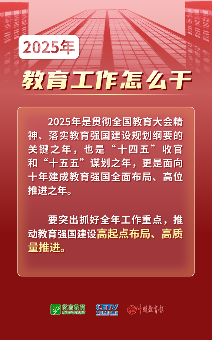1月9日—10日,2025年全国教育工作会议在北京举行。会议以习近平新时代中国特色社会主义思想为指导,全面贯彻落实党的二十大和二十届二中、三中全会精神,深入学习贯彻全国教育大会精神和习近平总书记关于教育的重要论述,总结工作、分析形势,统一思想、凝聚共识,围绕组织实施教育强国建设规划纲要,安排布置年度重点任务,确保教育强国建设高起点布局、高质量推进。会上说了啥,组图为你划重点——