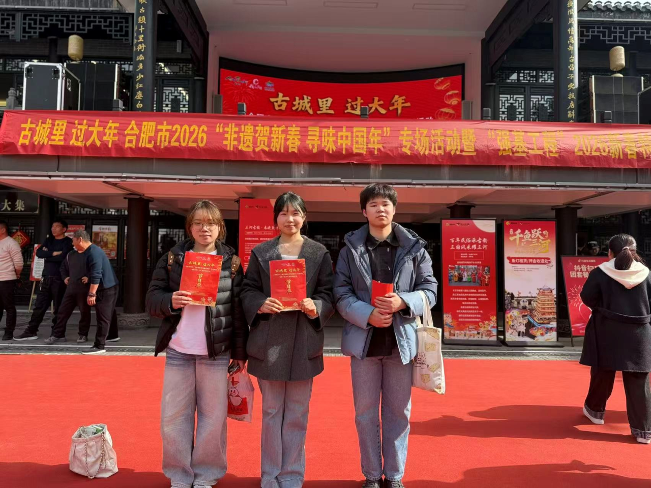 为弘扬中华优秀传统文化,助力非遗活态传承,二月二十二日,我院非物质文化遗产保护专业傅联骏、计雅玲、胡可三位同学以志愿者以身份走进三河古镇,参与“古城里过大年——合肥市2026‘非遗贺新春 寻味中国年’专场活动”,为传统年俗注入青春活力。