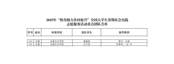 一直以来,我校始终将大学生社会实践作为实践育人重要抓手,依托艺术类专业优势,持续深耕地方、扎根基层开展志愿服务活动。此次两支团队的成功入选,是对我校语言文字推广工作的充分肯定,更是对我校志愿服务的高度认可。下一步,校团委将以此次成功入选为契机,严格落实教育部语言文字应用管理司、共青团中央青年发展部相关要求,精心组织、周密部署,按照服务计划扎实开展推普志愿服务活动,让安艺青年在推普助力乡村振兴中贡献青春力量。