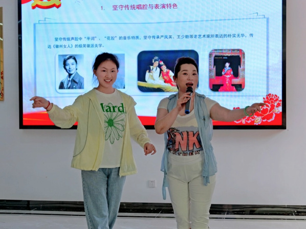 在女性文化赋能环节,校妇联副主席茆建琳带来的黄梅戏教唱成为现场焦点。她从黄梅戏的起源与发展脉络讲起,结合《天仙配》《女驸马》等经典选段,手把手传授唱腔技巧与情感表达。这场互动式教学不仅让乡村女性感受到传统戏曲的魅力,更以文化认同增强了她们的精神自信。