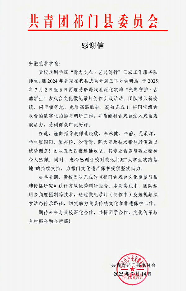 7月14日,共青团祁门县委员会向我校发来感谢信。感谢我校对校地共建“大学生实践基地”的支持,期待未来深化合作,共同推动团学合作、文化传承与乡村振兴融合发展。