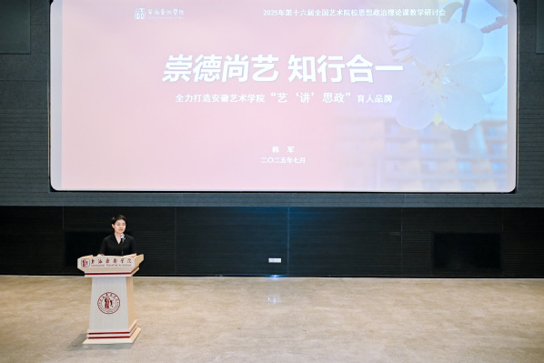 研讨会上,韩军以《崇德尚艺 知行合一 全力打造安徽艺术学院“艺‘讲’思政”育人品牌》为题,介绍安徽艺术学院打造的“艺‘讲’思政”育人体系。她指出,安徽艺术学院落实立德树人根本任务,秉持“崇德尚艺 知行合一”校训,发挥综合类艺术院校艺术专业门类齐全的优势,搭好“大平台”、建好“大课堂”、育好“大先生”、用好“大思政课”,连续5年打造“讲道理也讲故事、有意义也有意思”的“艺‘讲’思政”育人体系。“艺‘讲’思政”每年突出一个国家层面重大主题,打通课上教学和课外实践,联通思政课程和课程思政,汇通思想性与情感性,融通“思政小课堂”与“社会大课堂”,创新推动习近平新时代中国特色社会主义思想进课堂、进头脑、进教材,以艺术之美点亮思政之光。