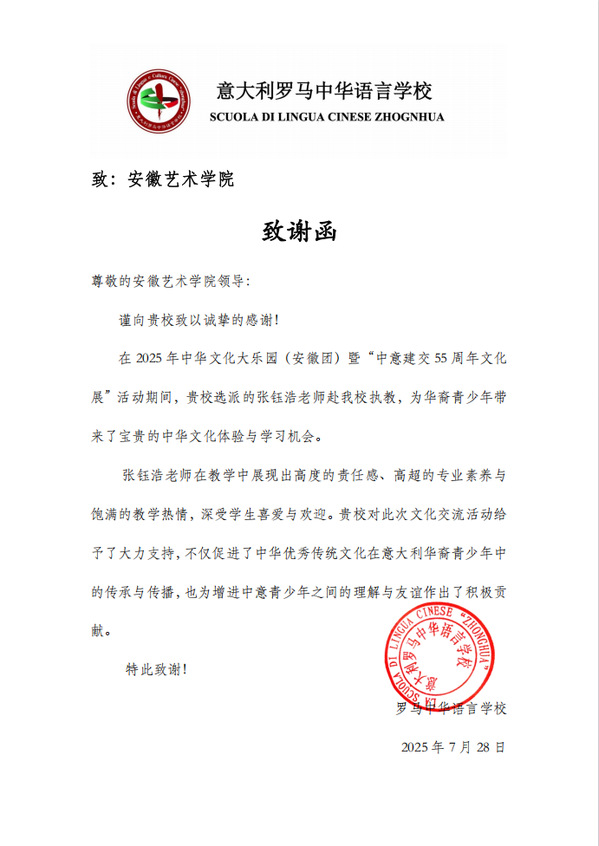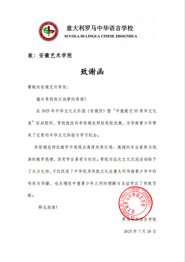 为深入贯彻落实中华优秀传统文化“走出去”战略,积极推动中华文化在海外的传播与传承,由安徽艺术学院主办、意大利罗马中华语言学校承办的2025年中华文化大乐园·意大利罗马营于2025年7月16日至28日在意大利罗马举行。本次文化交流活动以“中意友谊”为主题,面向在意华裔青少年进行中华传统文化的沉浸式教学与展示,取得较好效果,为此,意大利罗马中华语言学校向我校发来感谢信。
