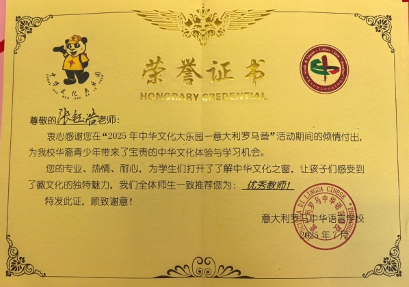 两位教师专业能力突出、教学经验丰富,充分发挥自身所长,将中华优秀传统艺术的美学精神、技艺特征与文化内涵深度融合,向海外华裔青少年展现了中华文化的独特魅力,为此,意大利罗马中华语言学校全体师生特别推荐李丽娟、张钰浩为优秀教师。