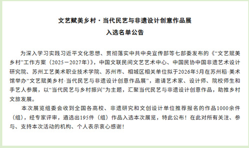 近日,由中国文联民间文艺艺术中心、中国民间文艺家协会中国非遗艺术设计研究院等权威机构联合主办的“文艺赋美乡村·当代民艺与非遗设计创意作品展”入选名单正式揭晓。在全国高校及文创单位推荐的 1000 余件(组)...