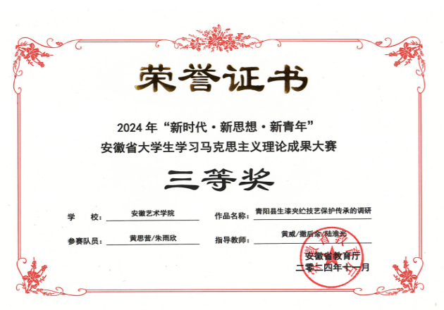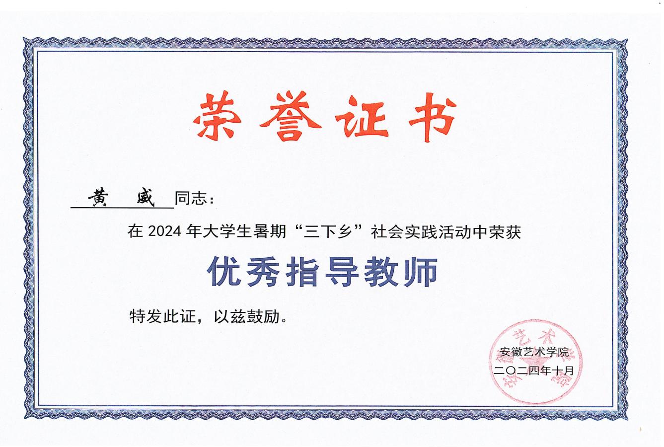 工作中,黄威同志紧密结合艺术类学生的思想特点和行为特征,积极探索思政教育的新途径、新方法。一方面,坚持用好课堂教学主渠道,依托主题班会、党团日活动等,深入开展理想信念教育、社会主义核心价值观教育、爱国主义教育,引导学生树立正确的世界观、人生观、价值观,将个人艺术追求融入时代发展洪流。另一方面,注重将思政教育融入专业实践,组织学生参与“设计改变家乡”、“非遗传承实践”等实践品牌活动,让学生在服务人民、奉献社会中砥砺品格、升华思想;利用专业展览、作品评选等契机,引导学生用艺术作品展现时代风貌、传递正向能量,实现思政与艺术的有机融合。通过持续努力,所带学生理想信念坚定,积极向党组织靠拢。在所带学生中,吴爽同学入选安徽共青团大学生科技创新志愿服务队,王馨悦同学担任校团委副书记(学生),胡姗姗和朱雨欣2名同学担任校长助理,所带班级黄思营和朱雨欣2名同学获2024年安徽省大学生学习马克思主义理论成果大赛三等奖,胡姗姗同学获安徽省第九届学宪法讲宪法素养大赛三等级,23环境设计1班获得2025年校级“优秀红旗团支部”荣誉称号。