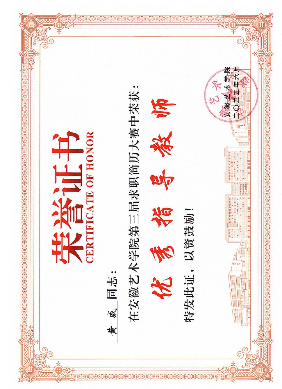 同时,黄威同志高度重视学生的职业生涯规划和就业指导工作。通过举办职业生涯规划讲座、简历制作与面试技巧培训,为学生提供全方位的就业服务。尤其针对设计行业的特点,引导学生树立正确的就业观、择业观,鼓励他们到基层一线、到需要创意设计的地方施展才华。所带学生王馨悦获得2025年安徽艺术学院第三届简历大赛一等奖、黄思营获三等奖。黄威被评为安徽艺术学院第三届简历大赛优秀指导教师。