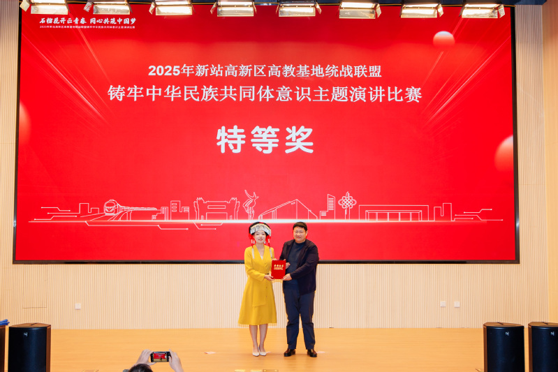 10月22日下午,在2025年新站高新区高教基地统战联盟“铸牢中华民族共同体意识”主题演讲比赛中,我院播音与主持艺术专业学生张贝贝,在18所学校24名参赛学生中脱颖而出,获得特等奖!