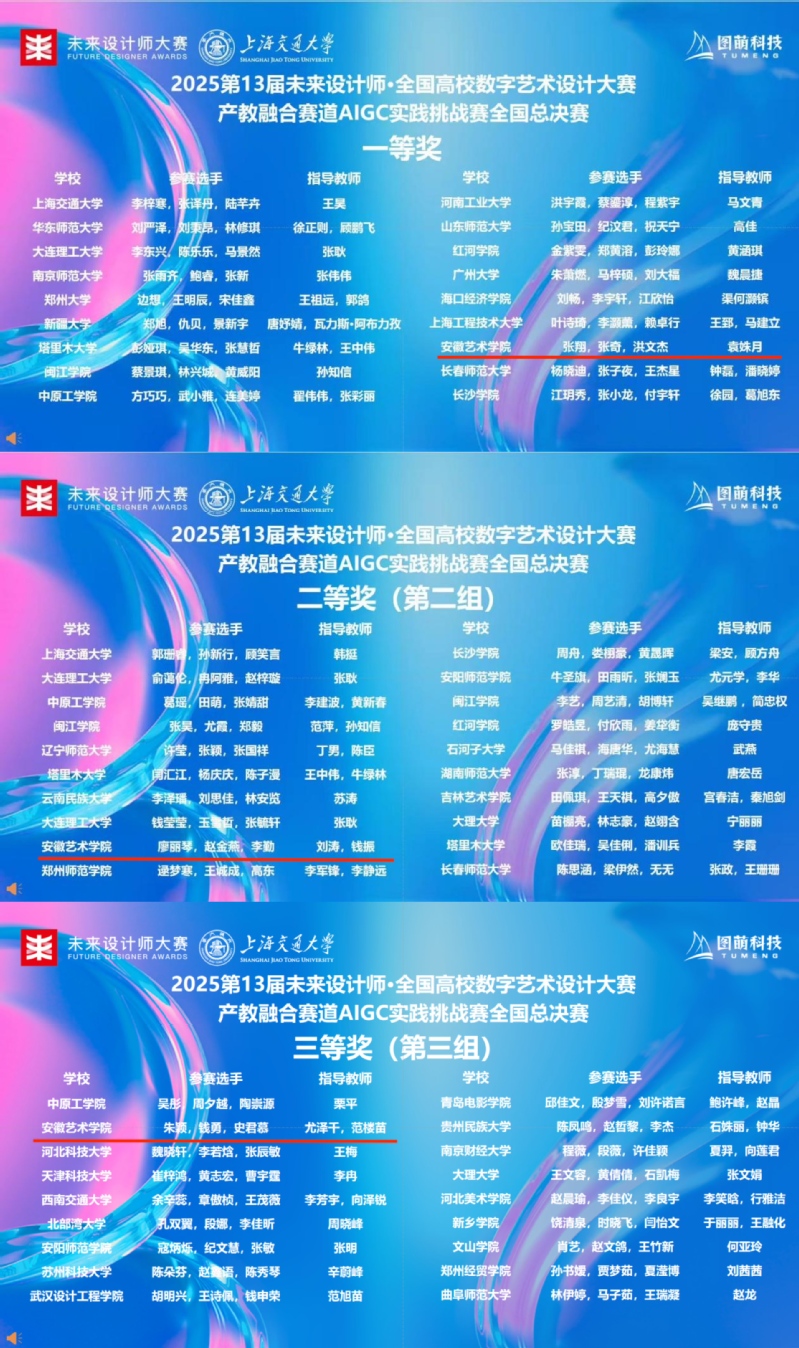 第13届未来设计师·全国高校数字艺术设计大赛产教融合赛道AIGC实践挑战赛全国总决赛于11月16日在上海交通大学落下帷幕。传媒学院学子凭借扎实的专业功底与创新实践能力脱颖而出,斩获一、二、三等奖各1项,展现了传媒学院在数字创意与 AIGC 技术融合领域的教育成果。
