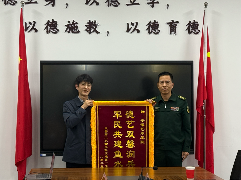 活动中,武警第二机动总队某支队向音乐学院管弦教研室赠与锦旗,以此感谢教研室在艺术文化交流、军民艺术共建等方面的支持与贡献。