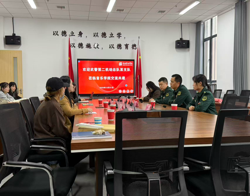 2025年10月31日15:00,武警第二机动总队某支队一行来到安徽艺术学院音乐学院,音乐学院院长李伟、副院长郭强、副书记丁梦溪,管弦教研室主任汪伊珺、办公室工作人员参会,双方开展交流共建活动。