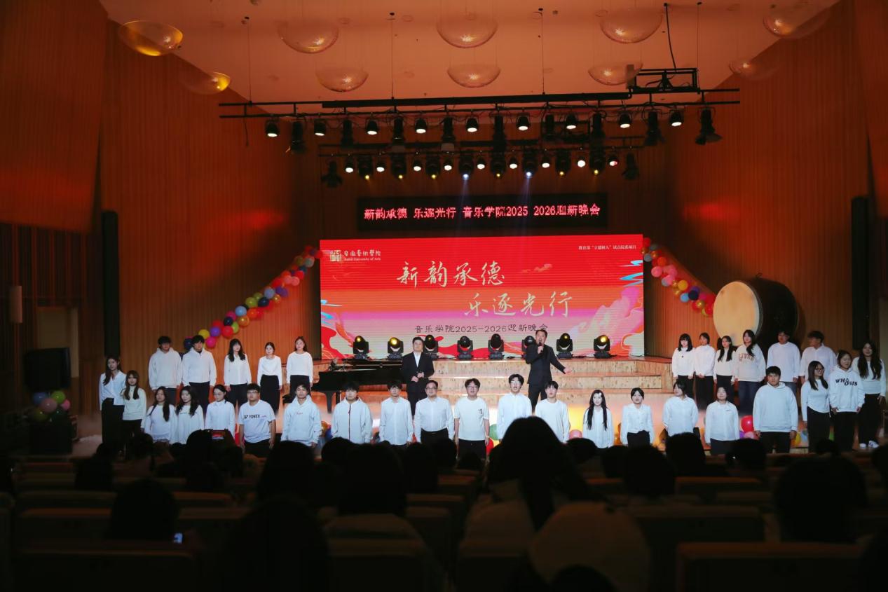 晚会最后师生合唱歌曲《向往》,表达了对音乐学院未来发展的美好祝福和对2025级新生的美好期许。整场晚会涵盖舞蹈、声乐、民乐、相声等多元艺术形式,既展现了音乐学院学子的专业素养与青春风貌,又彰显了全院师生凝心聚力、昂扬奋进的精神面貌。
