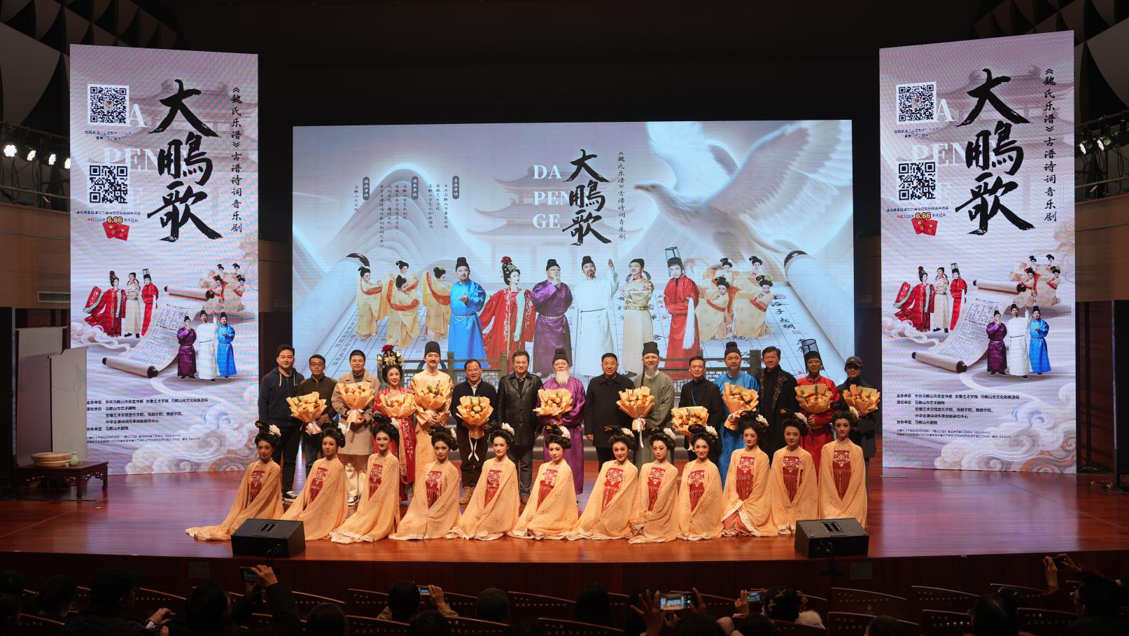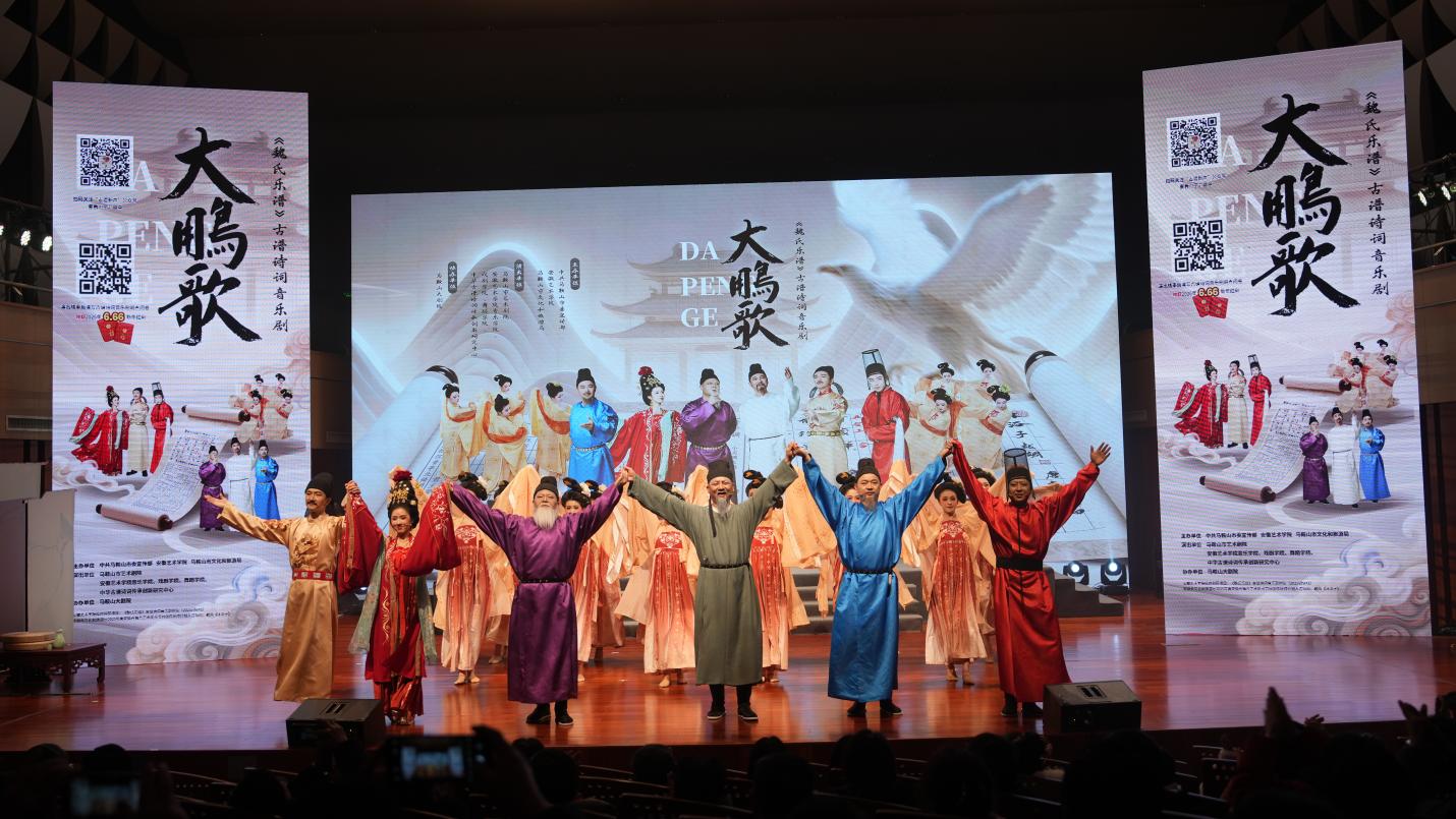 《魏氏乐谱》古谱诗词音乐剧《大鹏歌》是由安徽艺术学院与中共马鞍山市委宣传部、马鞍山市文化和旅游局共同主办,安徽艺术学院音乐学院、戏剧学院、舞蹈学院、中华古谱诗词传承创新研究中心与马鞍山市艺术剧院联合演出的全球首部《魏氏乐谱》古谱诗词音乐剧。本剧创作历时近一年,以明代古谱《魏氏乐谱》中八首李白古谱诗词为创作基础,选取李白“大鹏”文学形象作为音乐符号,结合李白在马鞍山留下的经典诗句,借助音乐、文学、戏剧、舞蹈、美术等元素进行艺术疗愈赋能,秉持“古为今用”理念,采用“古谱新声”思路,传承创新中华古谱诗词,着力打造马鞍山“李白”文化旅游与艺术疗愈产品。