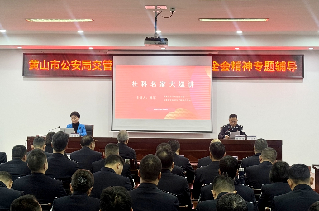 12月25日,学习贯彻党的二十届四中全会精神“社科名家大巡讲”活动走进黄山。省“社科名家大巡讲”宣讲团成员、安徽艺术学院党委书记韩军走进黄山市公安局交通管理支队和黄山学院作专题宣讲。
