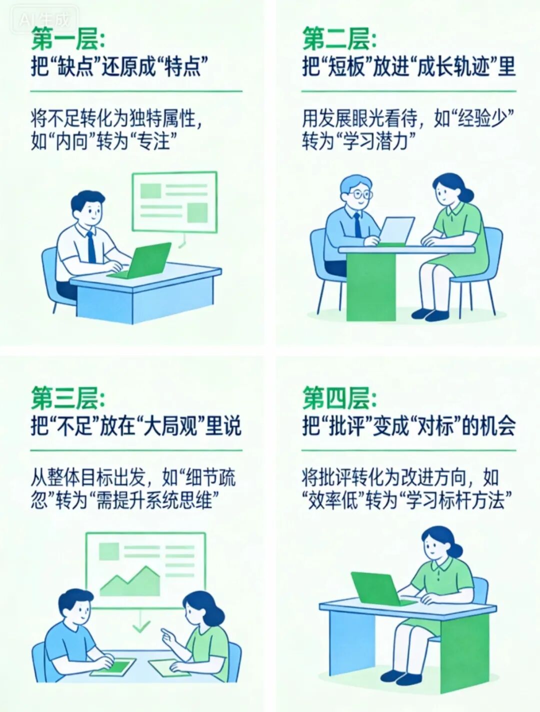 有些缺点,其实是成长的阶段性特征。如果你能让考察组看到,这个缺点正在被弥补,那就是加分。